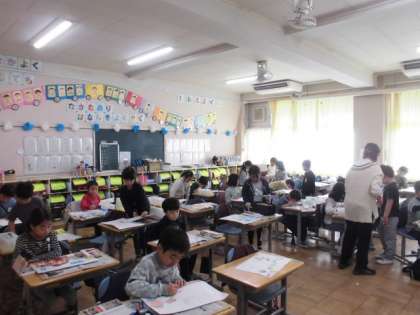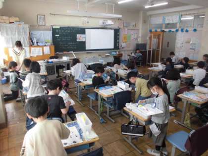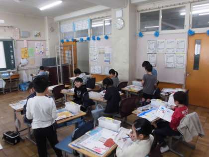 20日(火)1・2時間目、1年2組は図画工作の時間でした。「できたらいいな こんなこと」の続きに取り組みました。背景は絵の具で塗りましたが、色を混ぜたり、濃淡を付けたりして子どもたちの工夫がありました。
