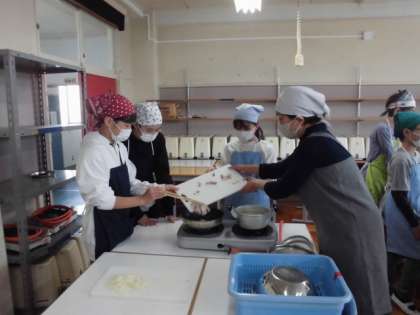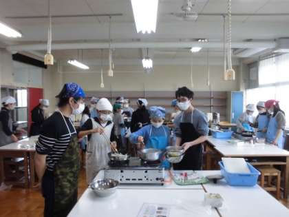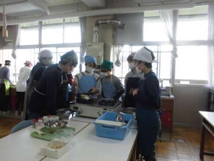 20日(火)5・6時間目、6年1組は家庭科の時間でした。今回は調理実習で「ジャーマンポテト」を作りました。身支度を整え、じゃがいもの皮を包丁やピーラーでむきました。皮を厚めにむくこと、芽を必ず取ること、切ったら水につけることを忘れずに行いました。じゃがいもは茹でてから炒めました。