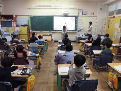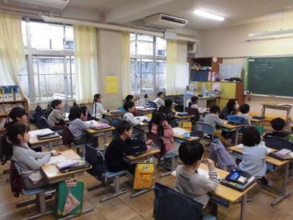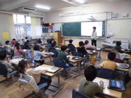21日(水)3時間目、1年1組は算数の時間でした。「ずにかいてかんがえよう」の学習です。黒板には「いすが6こあります。9人でいすとりゲームをすると、すわれない人は何人でしょう。」という問題が示されていて、子どもたちは考えながら図にかいていました。