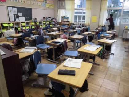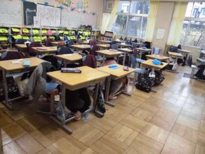 6日(水)2時間目、子どもたちへの予告無しで避難訓練を実施しました。午前10時過ぎに地震が起こり、その後給食室から火災が発生したという想定です。写真は緊急放送直後、机の下にもぐった1年生の様子です。