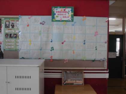 2階プレイルームの一角に「合唱団活動のふりかえり」を掲示しています。11月からの約3ヶ月間朝練習をしてきた子どもたちの感想が書かれています。府中市にある大きなステージでの写真も飾りました。