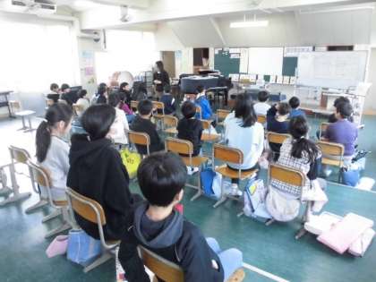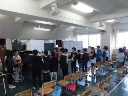 7日(木)5時間目、4年2組は音楽の時間でした。今月の歌「たんぽぽ」を歌ってから、「茶色の小びん」の学習に入りました。トライアングル、カスタネット、すず、タンバリンなどの楽器から1つ、グループで選ぶとしたら何にするかを話し合いました。最後は譜面上のBパートに合わせて、グループで選んだ楽器を叩いて楽しみました。