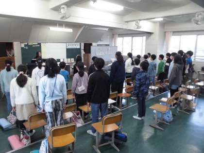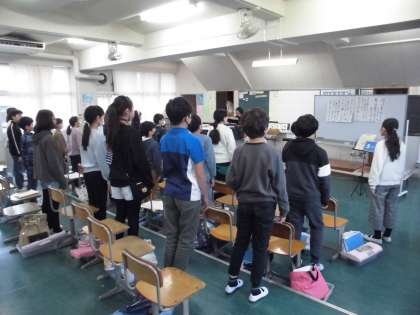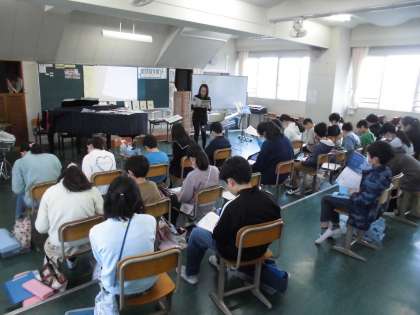 12日(火)2時間目、5年1組は音楽の時間でした。最初に今月の歌「たんぽぽ」を歌いました。次に、教科書にある「スキーの歌」を歌い、曲の最後に盛り上がることをみんなで感じました。最後は卒業式で歌う「あの樹をあおげば」を二部に分かれて練習しました。「これが歌詞カードを見て歌う最後です。」と音楽の先生から言われ、子どもたちも真剣に臨んでいました。