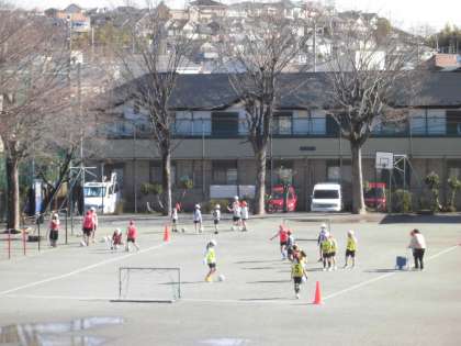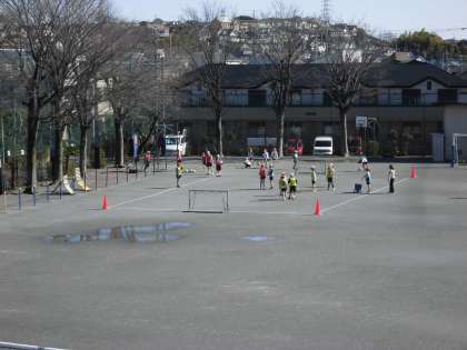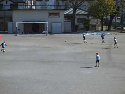 13日(水)1時間目、4年1組は体育の時間でした。前日の雨で校庭の一部には水たまりがありましたが、乾いている場所を使ってサッカーをしました。間もなく線を引き終え、チームごとに練習を始める様子です。