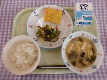 11日(木)の献立は、ご飯、千草焼き、海藻サラダ、豆腐とわかめのみそ汁、牛乳です。