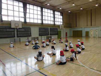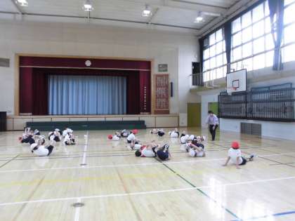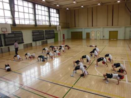 11日(木)5時間目、2年2組は体育の時間でした。体育館で体づくりの運動をしました。座って足裏を合わせ両足を上下に動かしたり、その体制で転がったりしました。ブリッジにもチャレンジしました。
