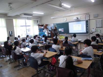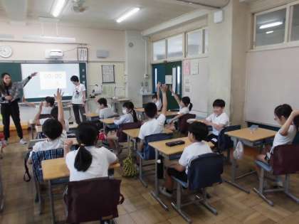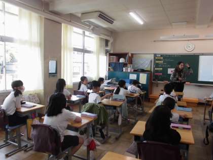 15日(月)3時間目、4年1組は外国語活動の時間でした。新しいALTの先生との初めての学習です。自己紹介をしながら、世界の挨拶について学びました。