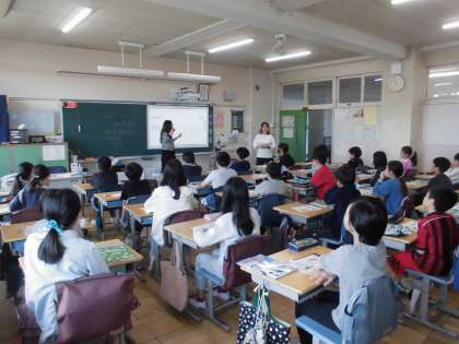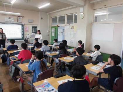 15日(月)4時間目、5年1組は外国語の時間でした。5年生からは外国語の学習が週2時間になります。2組の先生とALTとで進めます。新しいALTが自己紹介をしたり、月名の発音練習をしたりしました。