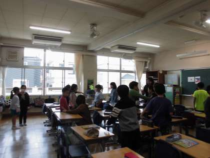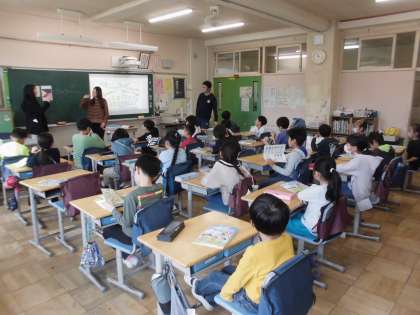 16日(火)3時間目、3年1組は外国語活動の時間でした。3年生は週1時間、外国語活動があります。担任の先生とALTとで進めますが、今回はMEPSの先生も加わりました。ALTの自己紹介を含め、みんなで「Hello」と挨拶をしながら楽しみました。