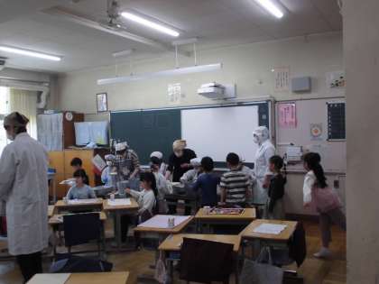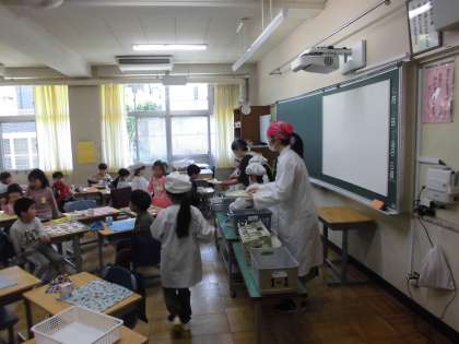 16日(火)から1年生の給食が始まりました。前日に練習をしたこともあり、子どもたちは落ち着いて配膳したり、トレイをしっかり持って自席に戻ったりすることができました。