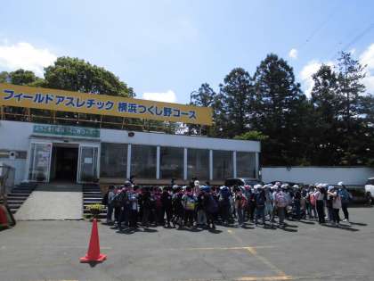2日(木)午前9時55分、目的地のフィールドアスレチックに到着しました。雨上がりの翌日だからか、小学校は本校だけで、他に高校生と一般の方だけでした。写真は到着直後の様子、広場にリュックを置いている様子です。その後、4年1組から順に集合写真を撮りました。