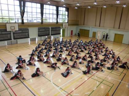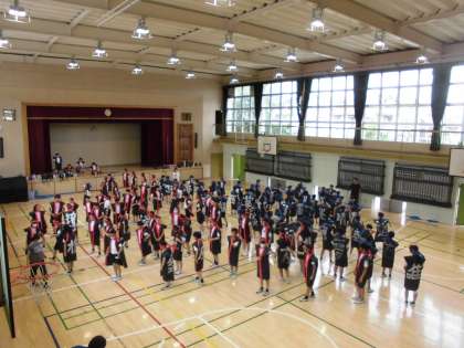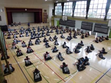 20日(月)6時間目、5年生と6年生は体育館でソーラン節の練習をしました。初めてはっぴを着て、頭にハチマキを巻きました。5年生は青色、6年生は赤色です。はっぴの背中にはアクリル絵の具で書いた漢字一文字がありました。2枚目と3枚目の写真は「ひし形」を作って踊る姿です。