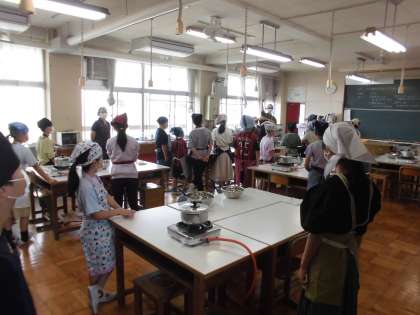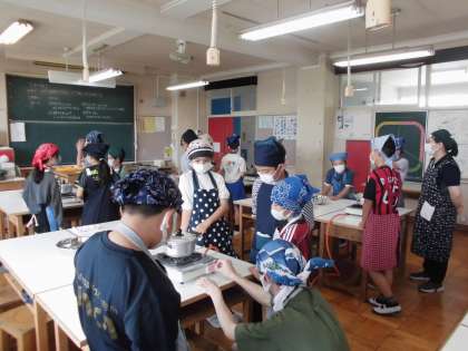 21日(火)1・2時間目、5年1組は家庭科の時間でした。「ゆで卵」を作る調理実習をしました。エプロンと三角巾を身に着けました。実習には栄養教諭も参加しました。沸騰してから7分後に火を止めました。