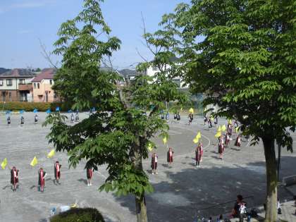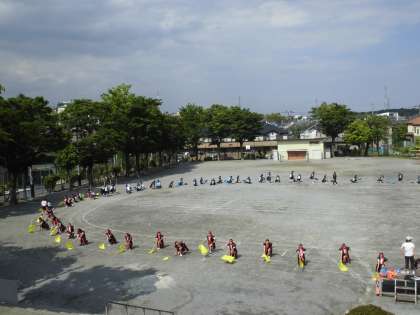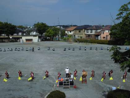 21日(火)6時間目、5年生と6年生は校庭でソーラン節の練習をしました。はっぴを着て、頭に鉢巻を巻いています。