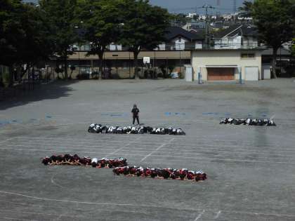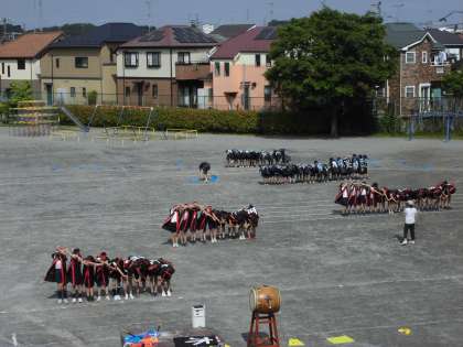 21日(火)6時間目、5年生と6年生は校庭でソーラン節の練習をしました。やっと二学年合同で外に出られました。ウェーブの様子です。