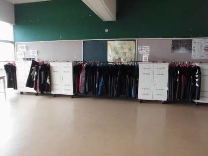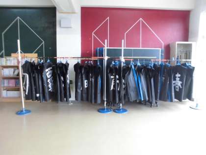 運動会の団体演技で5年生と6年生は黒いはっぴを着ます。練習後はしわにならないようにハンガーにかけています。そして3階プレイルームに写真のように保管しています。