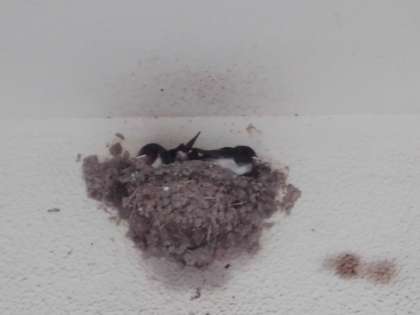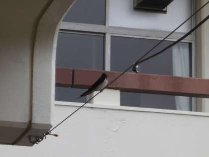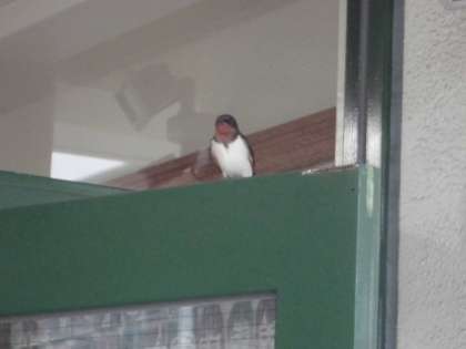 職員用玄関の上にツバメの巣があります。今年も4月からツバメが飛来し、ひなが誕生しました。そのひなが成長し、巣からはみ出そうです。親ツバメでしょうか、扉や電線から見守る姿があります。