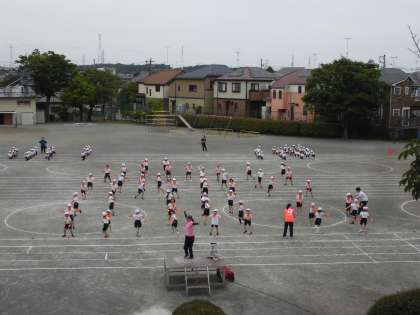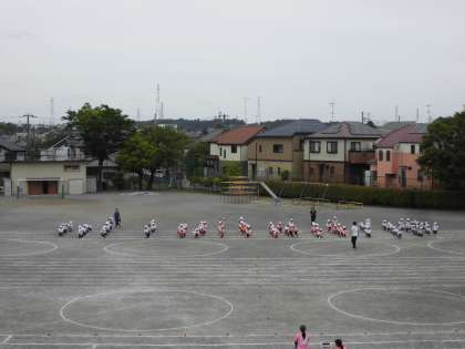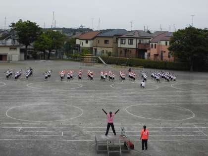23日(木)2時間目、1年生と2年生はダンスの練習をしました。明日はリハーサルのため、本日が最後の練習です。準備運動をしてから、入場の隊形に並びました。朝礼台から見て、左から1年1組、2年1組、2年2組、1年2組です。立て膝で待ちますが、最初に入場するのは2年生です。