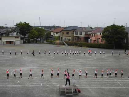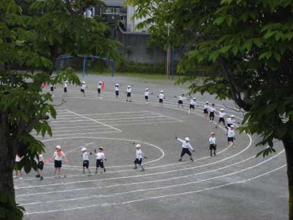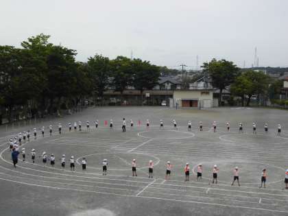23日(木)2時間目、1・2年生はダンスの練習をしました。校舎の方を向いて踊ってから、トラックに沿って大きな円を作りました。2年生はトラックの直線部分に並びます。1年1組は道路側のカーブ、1年2組は学童側のカーブに移動して踊ります。