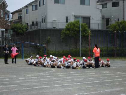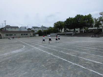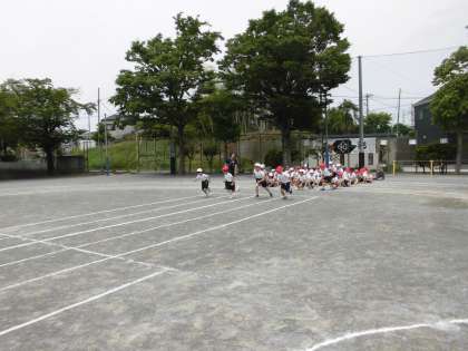 23日(木)4時間目、2年生は徒競走の練習をしました。入場門の近くに集合し、走る順に並びました。本番と同じように、雷管を打ってスタートしました。隣りに走る子が気になるのか横を向いて走る姿があり、真っすぐ前を向いて走ろうとゴール後に指導を受けました。