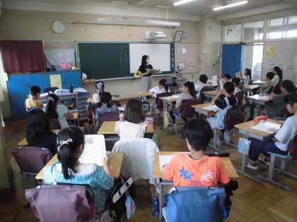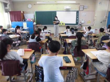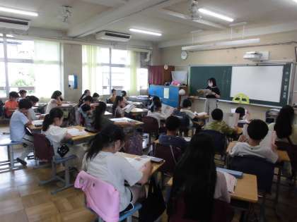 23日(木)6時間目、4年2組は道徳の時間でした。「どんどん橋のできごと」の話を読んで、自分の行動を見直すことがねらいです。写真は、先生が読む話を聞いている様子です。