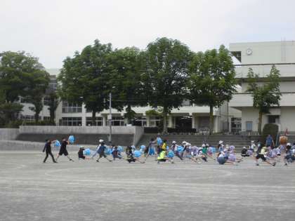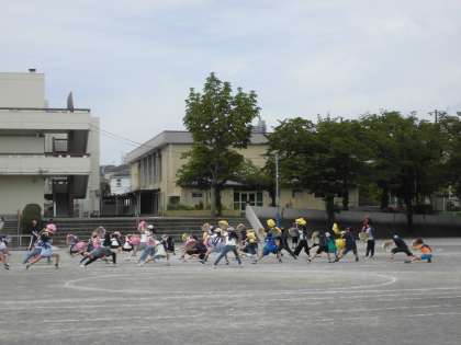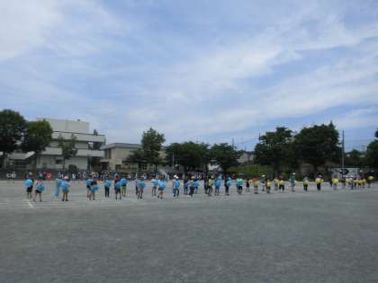 24日(金)3時間目、3・4年生は花笠音頭を入場から退場まで通しました。写真は下校庭から撮りました。隊形移動により3年生はテントの方を向きますので、そちらからご覧いただくこともできます。