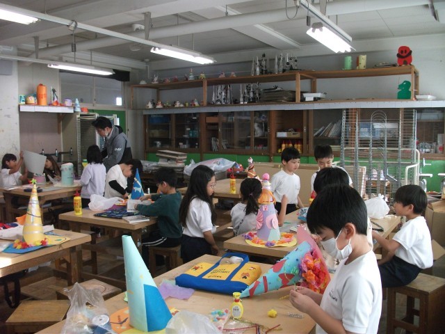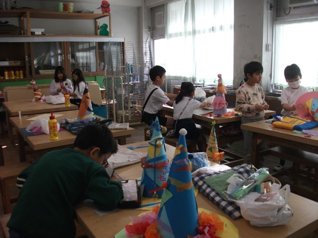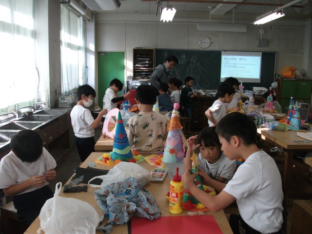 11日(水)1・2時間目、2年1組は図画工作の時間でした。「おしゃれな ぼうし」の仕上げに取り組んでいました。自宅から持ってきた飾りに一工夫を加え、帽子に付けていました。どの帽子もアイデア満載ですてきです。