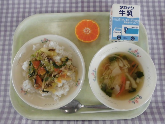 12日(木)の献立は、まちだご飯のスタミナ丼、ワンタンスープ、菊花みかん、牛乳です。