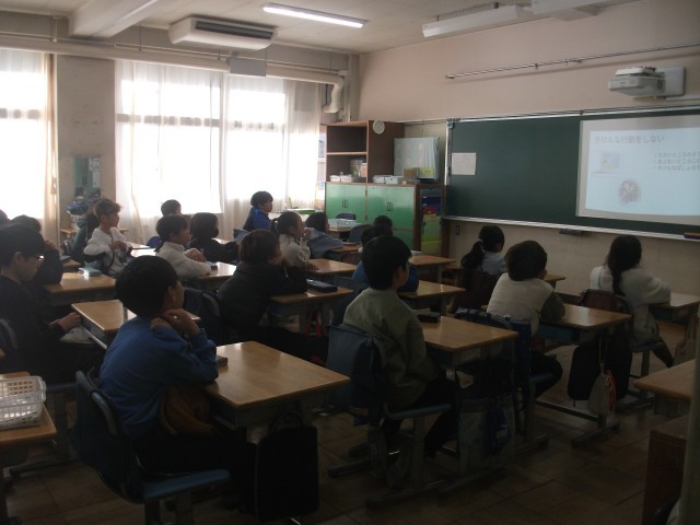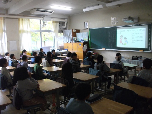 12日(木)の高ヶ坂タイムは、安全指導を行いました。本校では木曜日の高ヶ坂タイムを1週目心のアンケート、2週目安全指導、3週目サークル対話、4週目おはなしたんぽぽと割り当てて取り組んでいます。今回は、そうじ用具の使い方とクロムブックの扱い方を再度確認しました。学校生活に慣れてきたからこそ、ほうきやちりとりでふざけたり、タブレット端末を誤って傷付けてしまったりということがあります。改めて全員で確認することで、安全な生活が保たれます。写真は3年1組から1年1組までです。