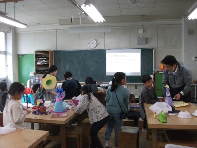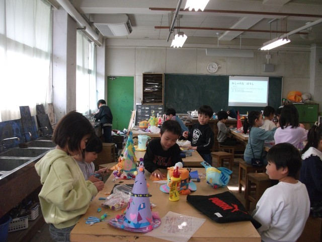 13日(金)3・4時間目、2年2組は図画工作の時間でした。「おしゃれな ぼうし」の仕上げをしました。自宅から持ってきた飾りに一工夫して、帽子につけました。より豪華な帽子になっています。
