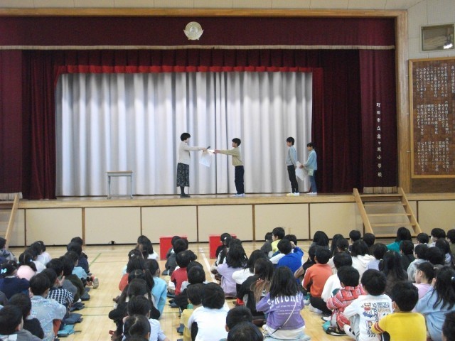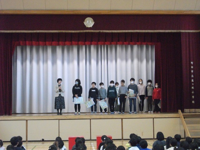 16日(月)は朝会をしました。最初に企画委員の5年生と6年生がメッセージを送ったり、挨拶をしたりしました。次は表彰を行いました。町田市こどもマラソン大会入賞者3名、バレーボール大会優勝2名、税に関する絵はがきコンクール参加賞4名、税の書道展金賞受賞1名、税の書道展参加者10名にそれぞれ賞状や記念品、参加賞を渡しました。いずれも自分から参加した活動に対して贈られた賞です。これからも子どもたちの「やってみよう」という気持ちを大切に育みたいです。
