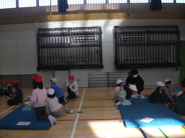 17日(火)2時間目、2年生はおもちゃ遊び会を開きました。体育館の校舎側に1組、道路側に2組が並んで活動しました。マット1枚にたてわり班の1年生と2年生が集まっています。1学期の学校探検や遠足をはじめ、たてわり班集会でも顔を合わせているので、すぐに打ち解けました。写真は2組の様子です。