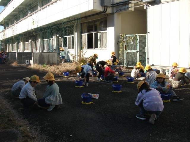 17日(火)5時間目、1年生は学年合同で生活科の時間でした。球根を植えるために、新たな土を入れる作業をしました。担任の先生が土の袋の片隅をはさみで切って渡し、一人ずつ鉢まで持って行きました。こぼさないように気を付けながら、すべての土を入れました。