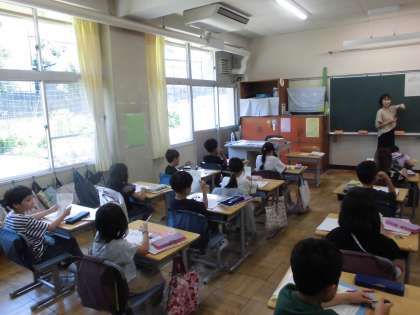 5日(水)3時間目、2年1組は国語の時間でした。「かんさつ名人になろう」の学習が始まりました。育てているミニトマトの観察カードを書く時に、大きさや手触り、におい、などに注目して書くとよいことを学びました。