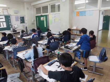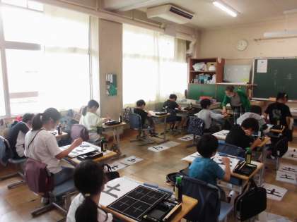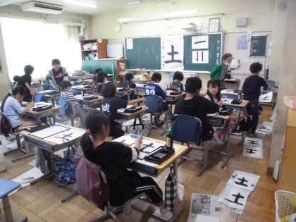 7日(金)3・4時間目、3年2組は書写の時間でした。講師の先生との学習です。今回は、縦線と横線に気を付けながら「土」と書きました。子どもたちは準備から片付けまで時間内でできるようになりました。