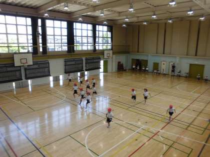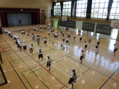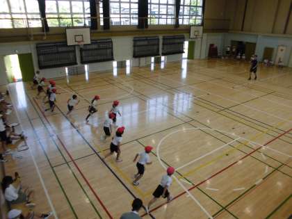 11日(火)3時間目、2年1組と5年1組は一緒に体力テストの一つ、20mシャトルランをしました。最初に準備運動をしました。次に2年生の赤組が走りました。5年生はスタートと20m先で時間内にたどり着いたかどうかを見守りました。