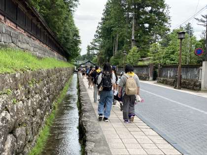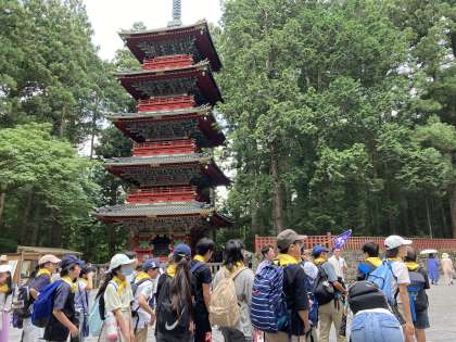 日光東照宮内の拝殿、鳴き竜を見学し終え、五重塔の前でガイドさんと別れました。話をよく聞いてくれたと褒めていただきました。1組、2組の順でバスに戻りました。
