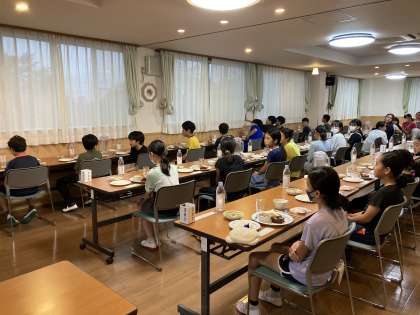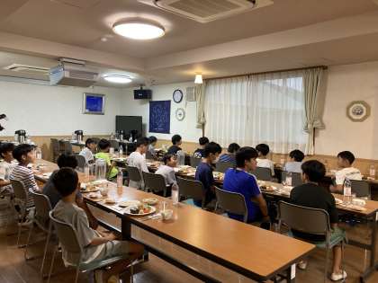 26日(金)午後6時半から夕食です。部屋ごとに食事係を先頭に並び、2階食堂へ移動しました。5分前行動ができています。感染防止と安全第一とする宿舎の方針により、横並びに座りました。