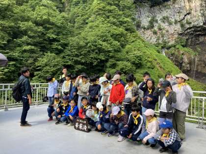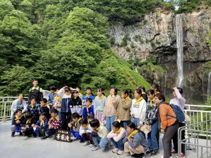 華厳の滝をバックにクラス写真を撮りました。団体としては一番乗りです。