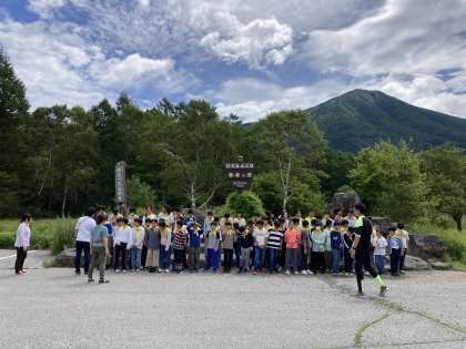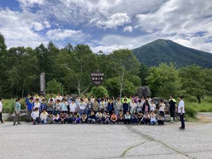 午後に雨が降る予報を受けて、ハイキング前に三本松で学年集合写真を撮りました。男体山をバックに3列に並んで撮影しました。
