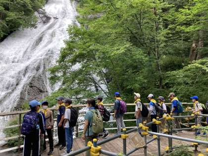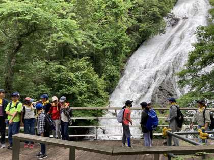 ハイキングの始まりは湯滝です。滝を見て、グループごとに写真を撮りました。