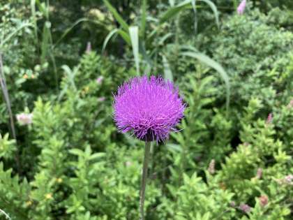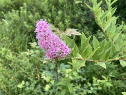 ハイキング途中で見た植物です。上からホザキシモツケ、アザミです。特にホザキシモツケは群落で咲いていました。