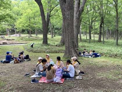 27日(土)午後12時40分、グループごとにおにぎり弁当を食べました。シートを敷き、その上で楽しそうに食べていました。