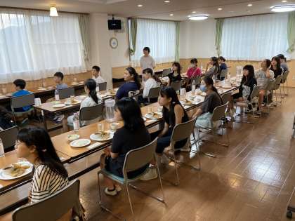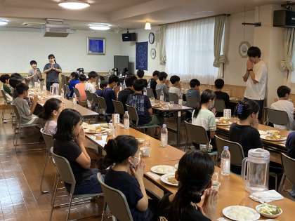 夕食の様子です。食事係さんは、一言ずつ今日の振り返りや明日のことを話します。その後、みんなで手を合わせ、いただきますと挨拶します。