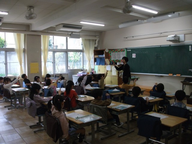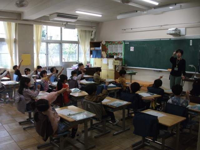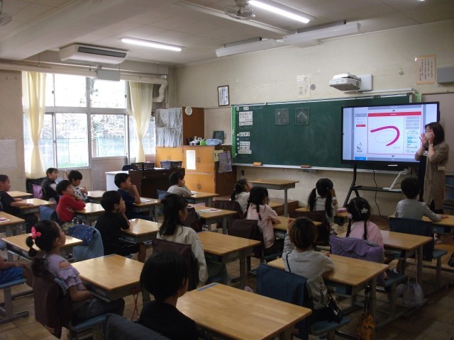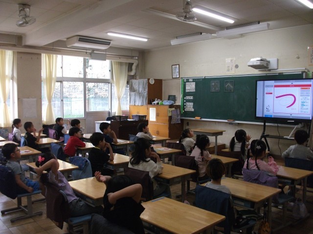 17日(木)1年生の高ヶ坂タイムはひらがなの学習をしました。一回で書くことができるひらがなから学習をしています。今回は、「つ」の字を練習しました。電子黒板を見たり、腕を伸ばして空書きしたりしました。