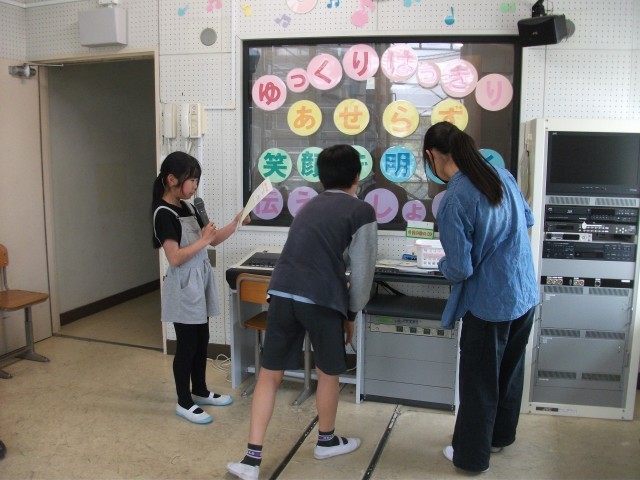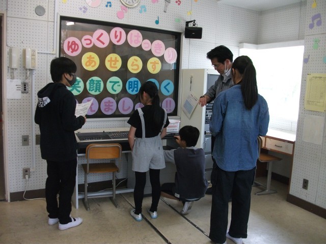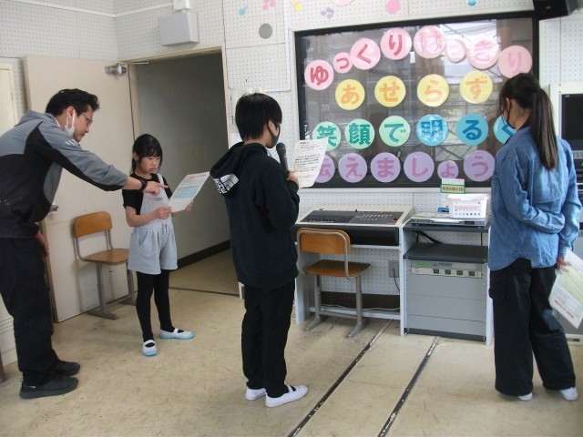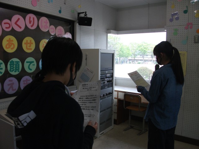 18日(金)お昼の放送の様子です。15日(火)から新体制で仕事が始まっていますが、曜日によって担当者が違うため、最初のうちは担当の先生も見守りに来ています。原稿を何度も読んで本番に臨み、読み終えるとホッとしたよい表情を見せていました。