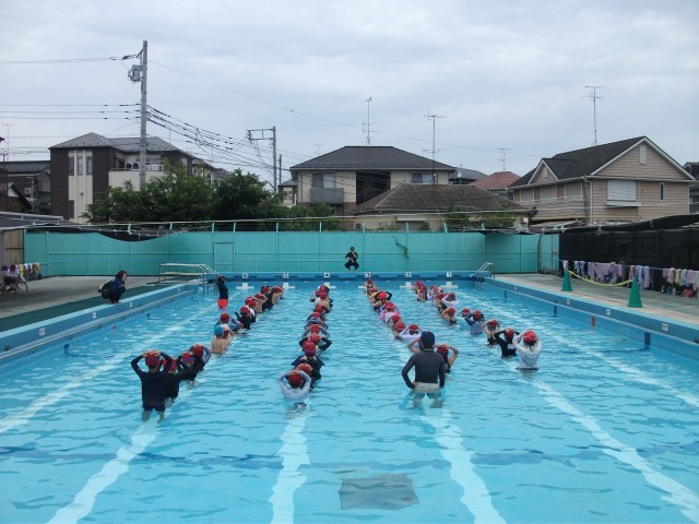 12日(木)3・4時間目、1年生と2年生は「水遊び」の時間でした。今年最初のプールに入りました。着替え、整列、バディの確認、準備運動、シャワーを浴びて再び整列しました。子どもたちは初回ということもあって興奮気味でしたが、「話を聞くこと」「プールサイドは歩くこと」などの約束を理解しました。入水の仕方を先生がやって見せてから、1列目、2列目の順で入水しました。