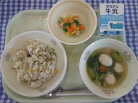 5日(金)の献立は、豚のひき肉入りピラフ、ビーンズサラダ、鶏だんごスープ、牛乳です。
