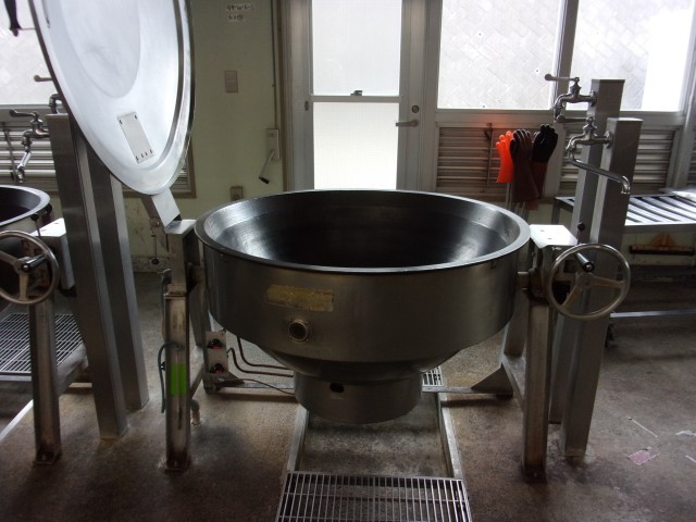 本校の給食室には、この回転釜が5台あります。100㎏のカレーうどんもこの釜で作ることができます。