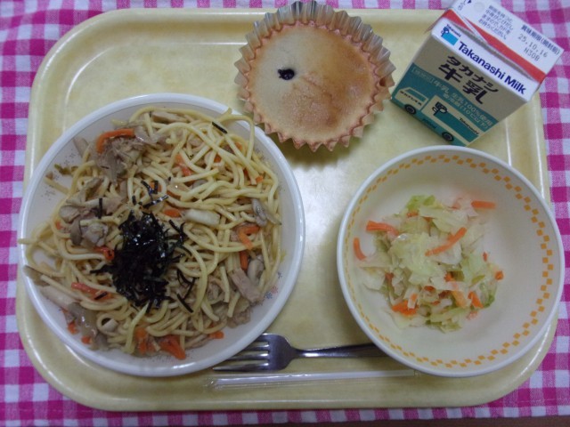 今日の給食は、牛乳・和風ツナきのこスパゲッティ・キャベツのレモン和え・米粉のブルーベリーマフィンです。